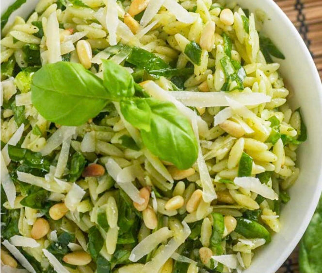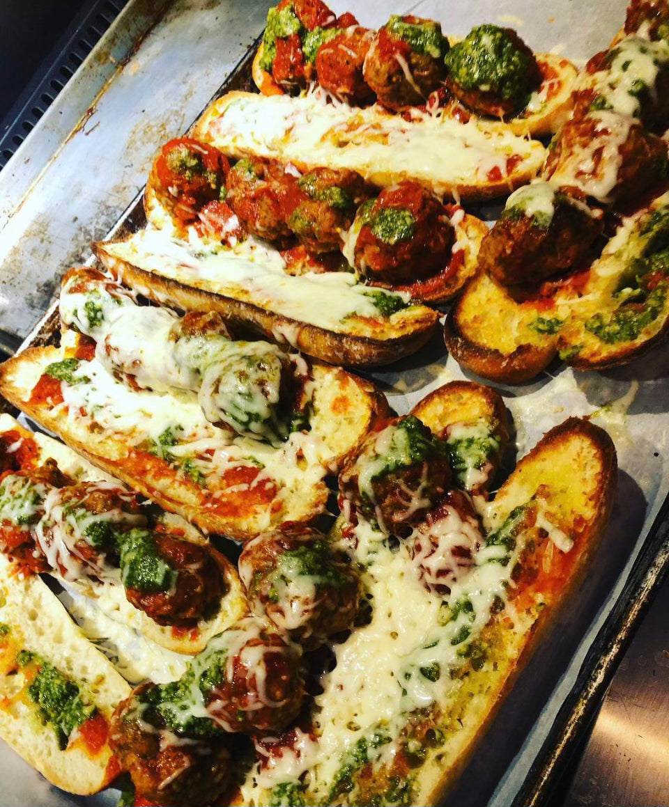 Meatball Sub with marinara sauce, provolone + pesto. Comes with an Orzo Pasta Salad with pesto, artichoke hearts + spinach.